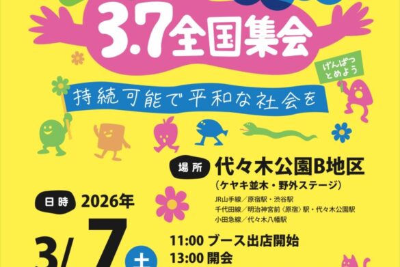 フクシマ原発事故から15年 とめよう原発3.7全国集会―持続可能で平和な社会を― 日時:2026年3月7日(土) 13:00開会/14:15終了/14:30パレード出発 会場:代々木公園B地区イベント広場・野外ステージ 内容:11:00 ブース開店、12:30 オープニングライブ、13:00 メインステージ開会、14:30 パレード出発 主催:3.7脱原発全国集会 実行委員会 「さようなら原発1000万人アクション実行委員会」を含めた9団体で「3.7脱原発全国集会実行委員会」を結成し、3月7日(土)に、代々木公園において、全国集会を開催することとなりました。 「さよう