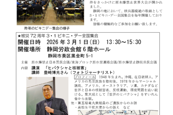 1954年3月1日、ビキニ環礁でのアメリカによる水爆実験によって、「第五福竜丸」をはじめとする日本の漁船が被爆しました。このことをきっかけに日本における原水爆禁止運動が大きく拡がりました。私たちはこの被害の実相を継承し、核廃絶の決意を確認するため、毎年3月1日前後に静岡での集会を行ってきました。 本年については3月1日、下記の通り現地集会を開催しますので、ご案内します。 →チラシデータはこちら( PDF ) 被災72周年3.1ビキニ・デー全国集会 日時:3月1日(日)13時30分~15時30分 場所:静岡労政会館6階ホール(静岡市葵区黒金町5-1静岡県勤労者総合会館内