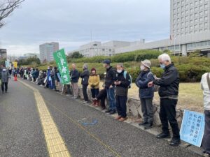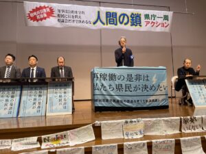 集会後には県庁包囲行動「人間の鎖」が実施され、1,200人が手を取り合い、知事の再稼働容認に抗議の声を上げました。県庁を取り囲んだ人びとからは、「安全と信頼を最優先に」「民意を無視した再稼働は許されない」との思いが力強く示されました。