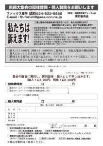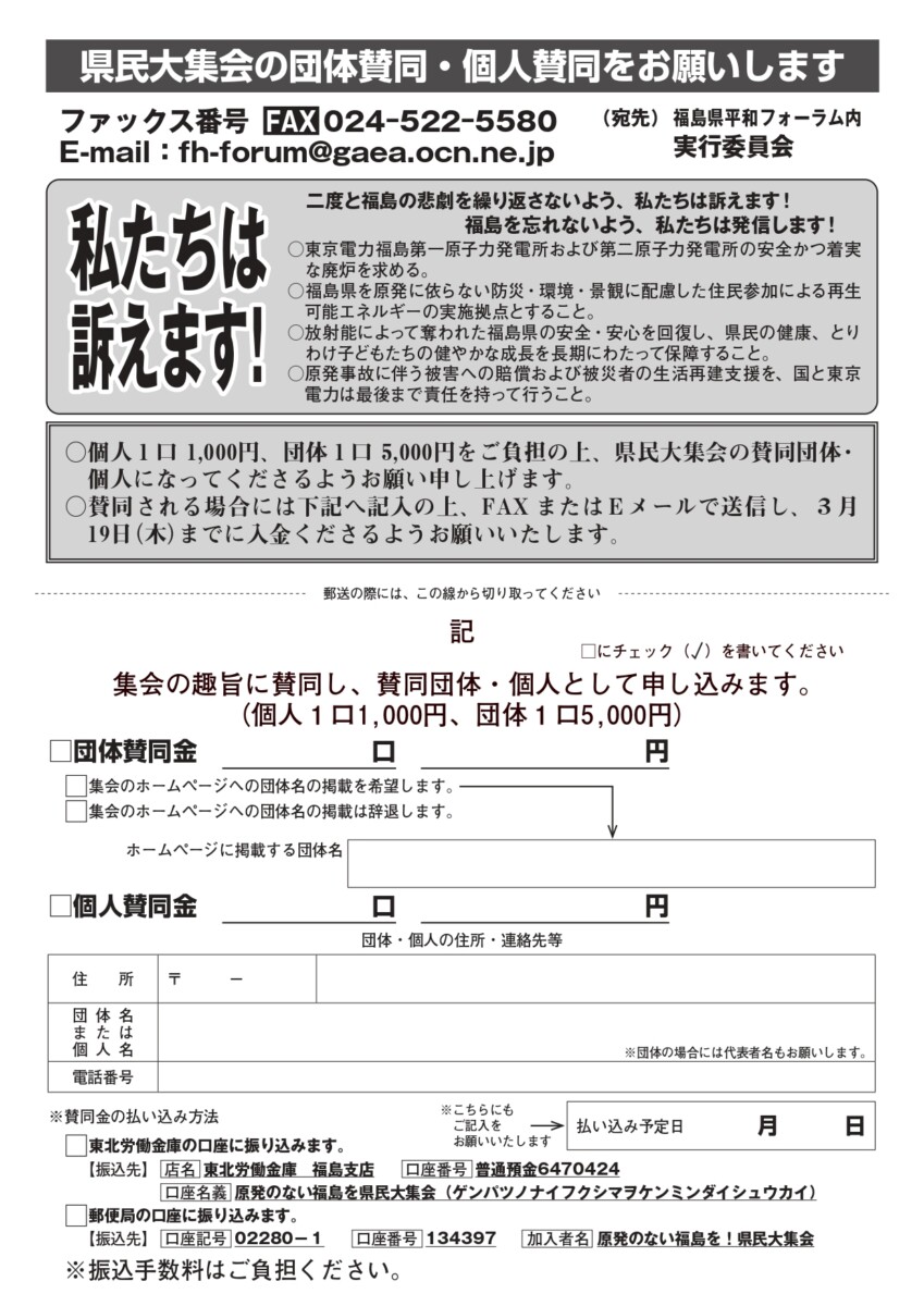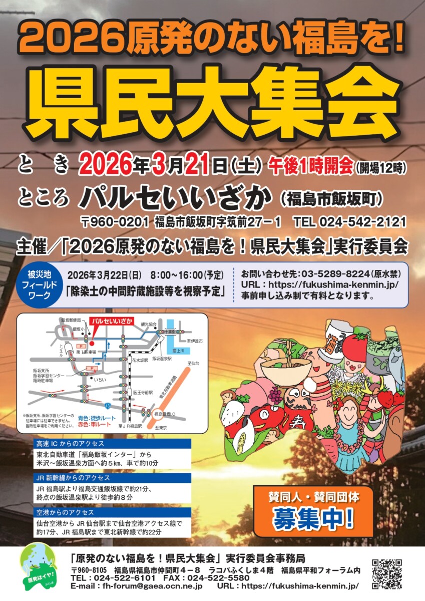 主 催:「2026原発のない福島を!県民大集会」実行委員会 TEL 024-522-6101/FAX 024-522-5580
