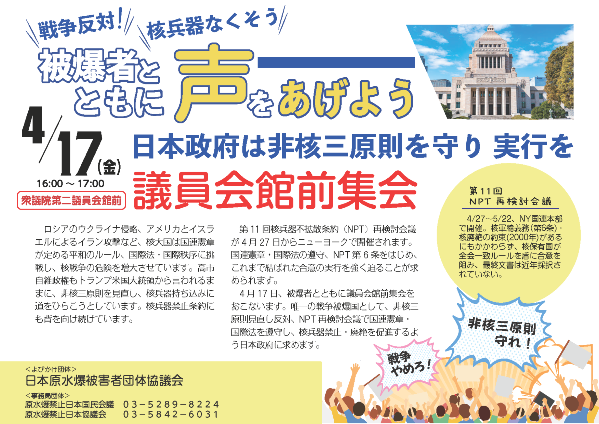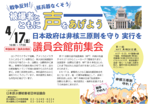 被爆者とともに声を上げよう 日本政府は非核三原則を守り実行を 4.17議員会館前集会のご案内